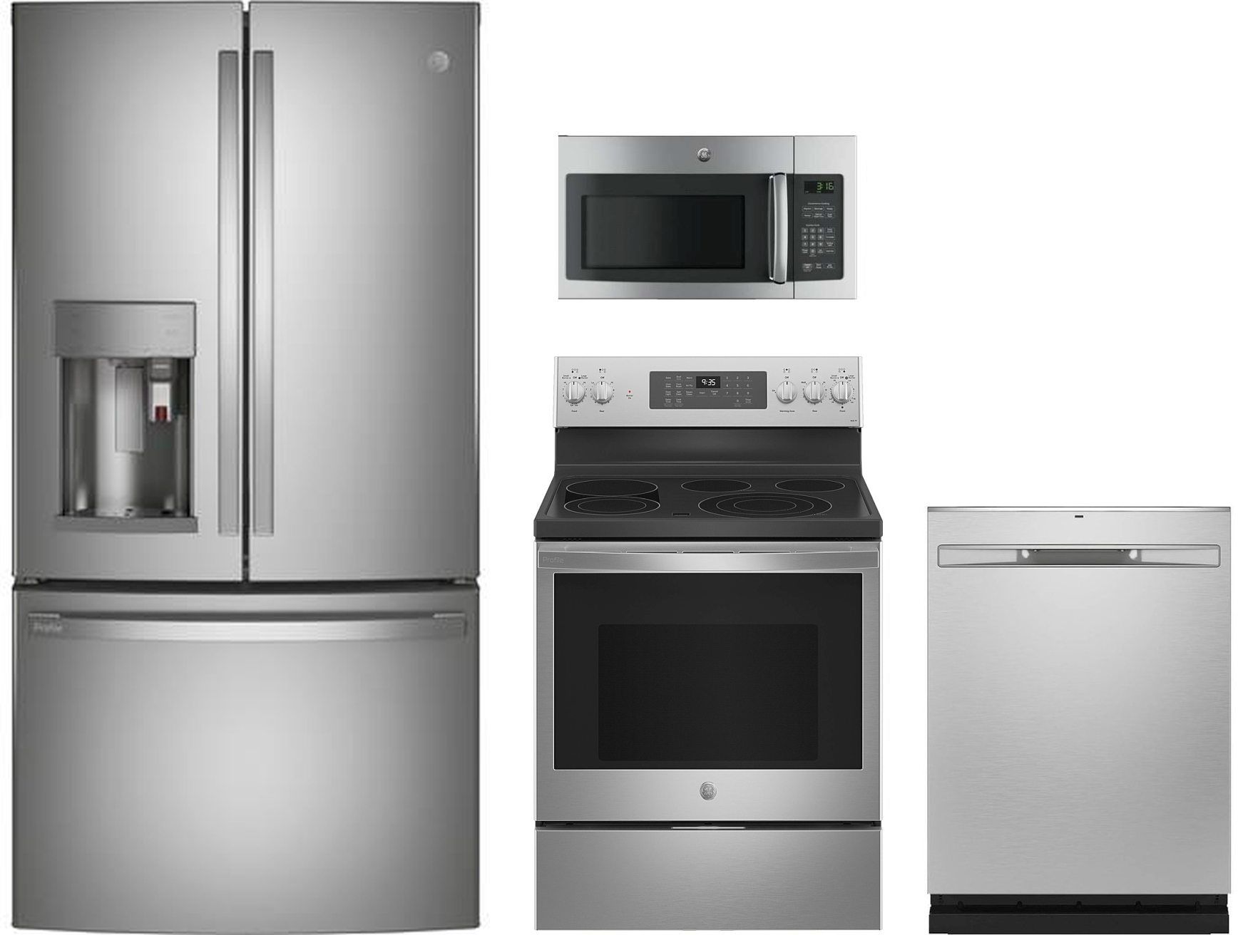 GE Profile™ 4 Piece Kitchen Package-Stainless Steel with counter depth french door refrigerator, free standing electric convection range , built in dishwasher, and over the range sensor microwave ovenRead More