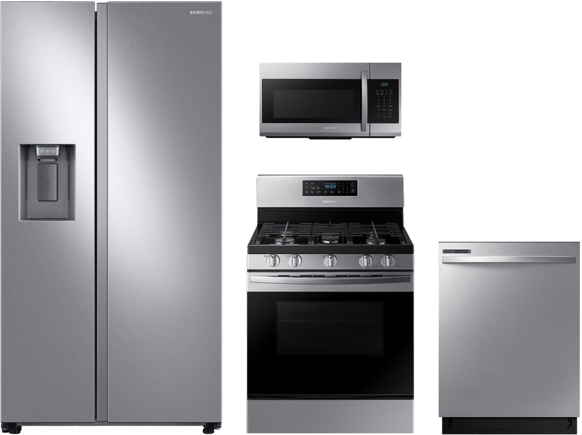 Samsung 4 Piece Stainless Steel Kitchen Package with side-by-side refrigerator, free standing gas range, built in dishwasher and over the range microwaveRead More